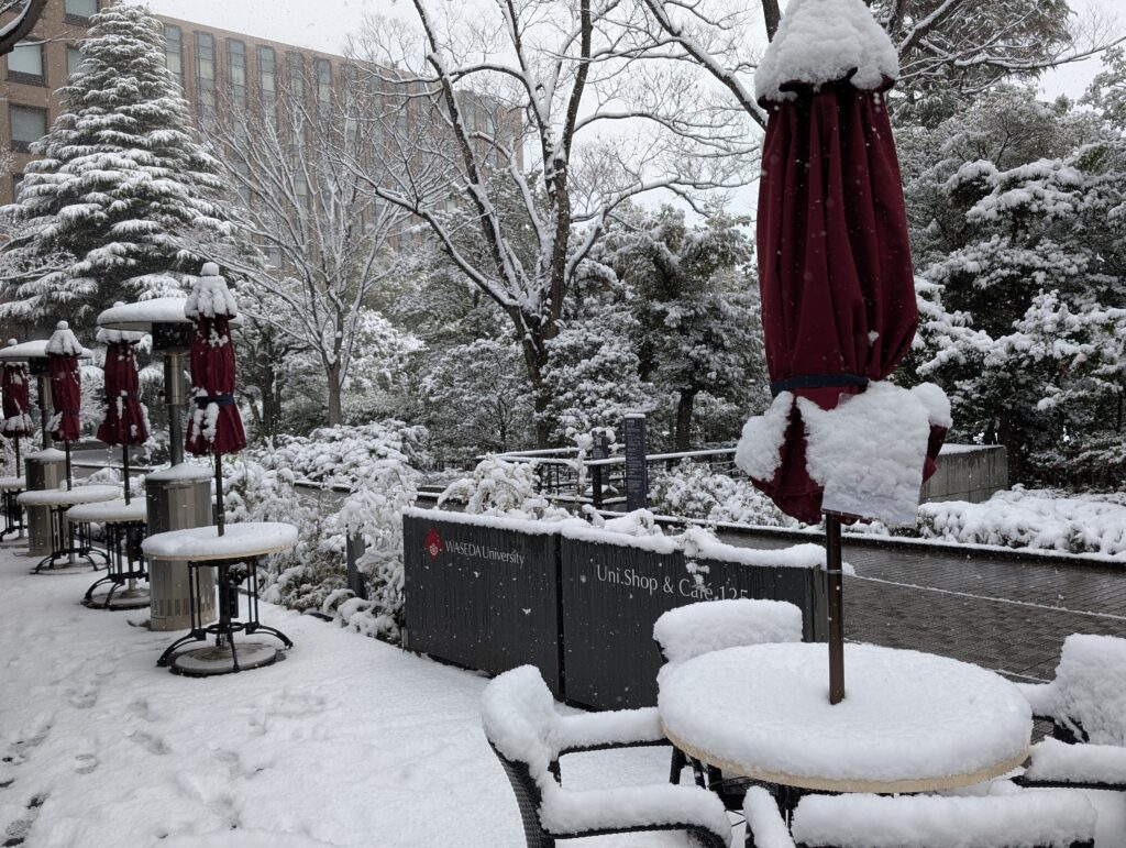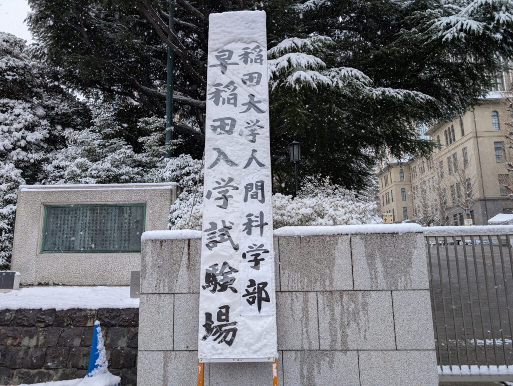 雪のせいで、早稲田大学の「早」の字が見えなくて、稲田大学になっていました。